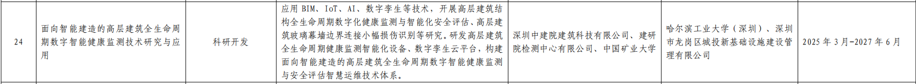 ?由公司牽頭申報的科技項目《面向智能建造的高層建筑全生命周期數(shù)字智能健康監(jiān)測技術(shù)研究與應(yīng)用》,成功通過2025年深圳市工程建設(shè)領(lǐng)域科技計劃項目(第一批)評審并獲批立項。